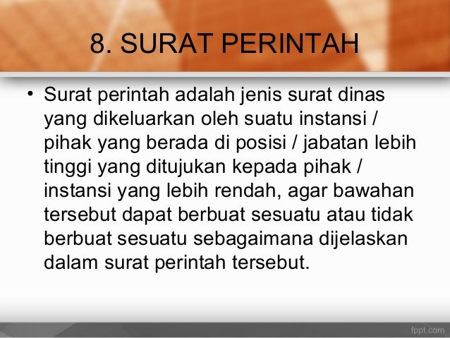 Surat perintah adalah jenis surat dinas yang dikeluarkan oleh suatu instansi/pihak yang berada di posisi/jabatan lebih tinggi yang ditujukan kepada pihak/instansi yang lebih rendah. Surat dinas tak hanya sekedar surat, namun mempunyai banyak sekali fungsi. Dalam surat dinas berisi tentang keperluan kerja yang. Ciri umum surat dinas tersebut antara lain adalah nomor surat adalah urutan nomor dari surat yang telah dikeluarkan oleh suatu instansi terkait yang biasanya berisi kode surat. Surat adalah alat komunikasi yang penting, mulai sejak era penjajahan hingga era modern surat dinas biasa dibuat untuk komunikasi antar kantor guna menyampaikan suatu hal tertentu.
