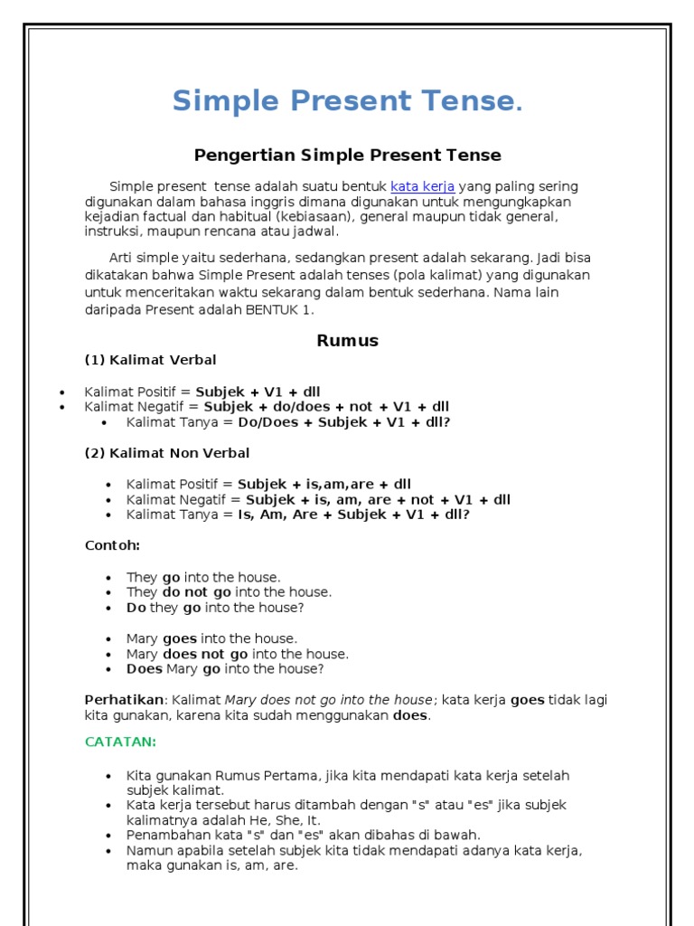 Pengertian Rumus Contoh Kalimat Simple Present Tense By Kincet Issuu from image.isu.pub Rumus dan contoh kalimat simple present tense nominal lengkap beserta latian soal. Menyatakan peristiwa yang sudah dapat dipastikan akan terjadi atau. Kalo kamu ngerasa sudah mengerti terkait apa itu verbal, non verbal, dan sudah paham pengertian kalimat positif, negatif, interogatif. Subject + to be (is, am, are) + kata kerja + ing tense ini dipakai untuk menjelaskan tentang: Menyatakan permintaan atau perintah pada lawan bicara; Kalimat instruksi biasa dinyatakan dalam bentuk simple present. Dalam membentuk kalimat simple present tense (nominal), predikat yang digunakan berupa to be. Ada penggunaan do does is am are dalam kalimat dan juga penjelasan singkat tentang verbal dan non verbal.